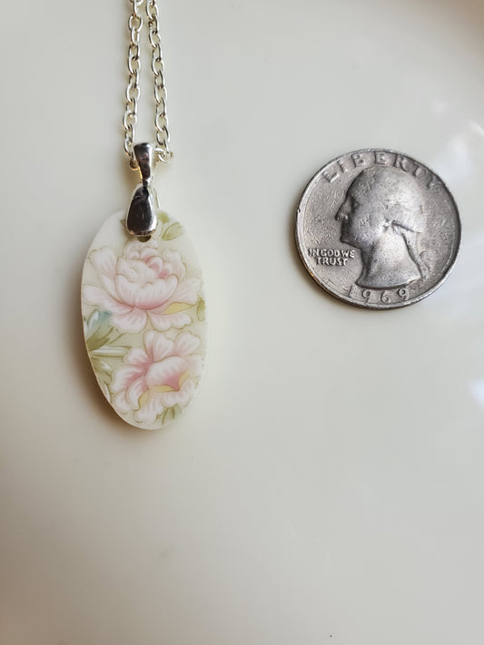 10" Silver Handmade Pink Flower Oval Broken China Necklace