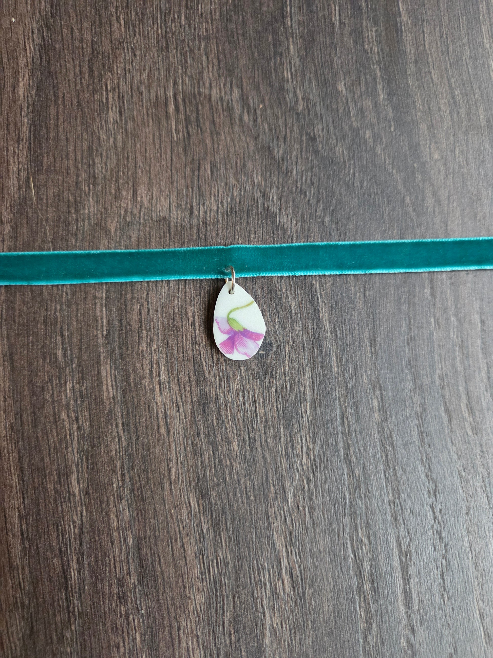 14" green velvet choker with purple flower broken china plate with teardrop shape