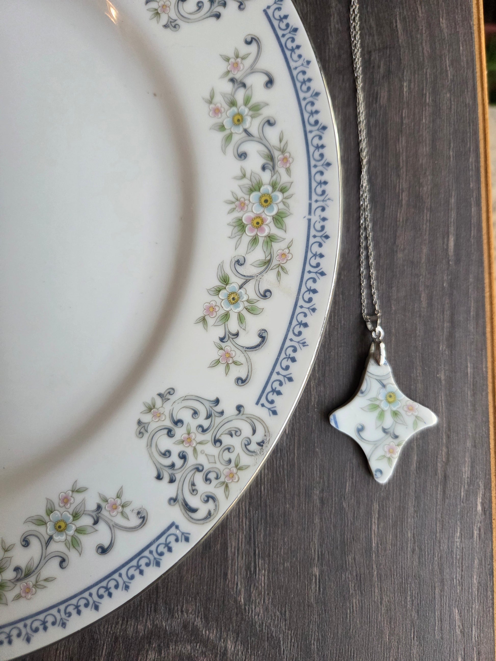 Blue flowers broken china cross necklace on a .925 silver plated chain necklace